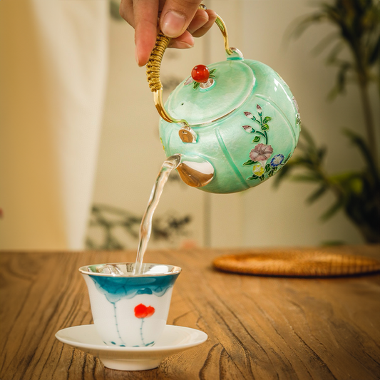 Kung Fu Hand-Hammered Silver Teapot Butterflies Chasing Flowers Cloisonne Teapot