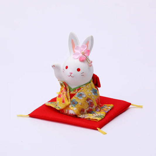 Yakushigama Rabbit Flowery Chirimen Japanese Lucky Rabbit Figurine(Right Hand Waving)