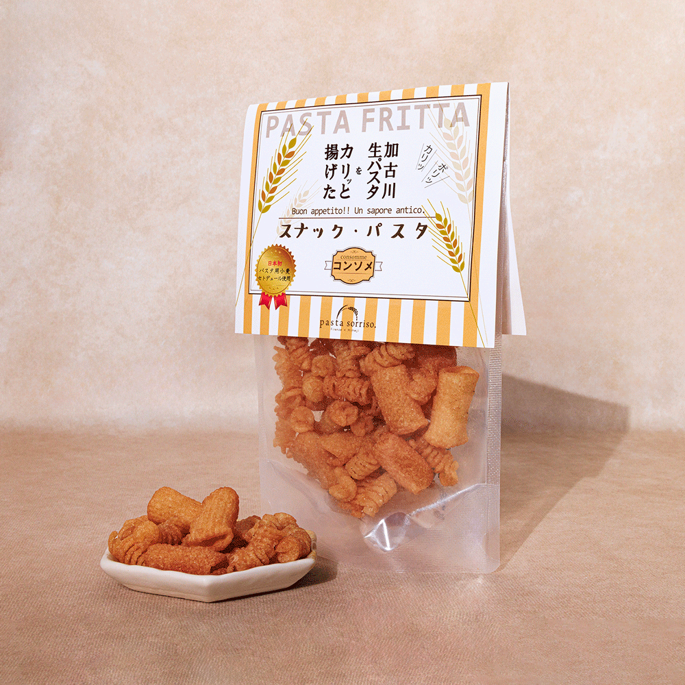 Yahata Eino, located in Kakogawa City in Hyogo Prefecture, produces pasta using Seto Duure. This is a pure domestically-grown durum wheat that Yahata Eino successfully cultivated for the first time in Japan. During cultivation, they do not use the herbicide glyphosate, making it healthier for consumption. This snack version of pasta primarily utilizes the cut-off ends of pasta produced for packaging.