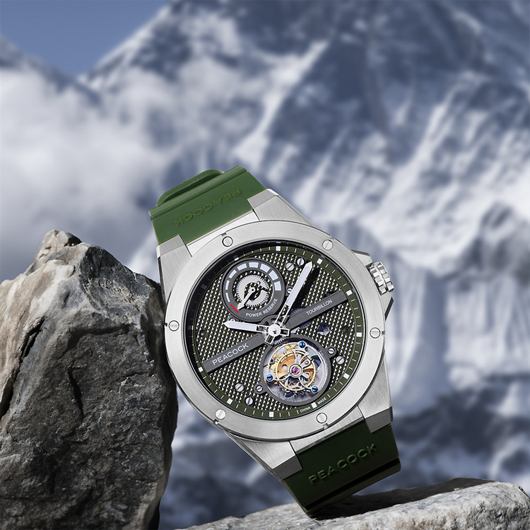 In tribute to the 1985 Sino-Japanese joint mountaineering team, who successfully summited Mount Nuptse while wearing Peacock watches, the PEACOCK Explorer Series - Climber Tourbillon Watch honors their legacy. This watch celebrates and continues their tradition, saluting climbers who risk their lives for their beliefs and embody the fearless, limit-defying spirit of mountaineering. It upholds Peacock's dedication to precision timekeeping and the relentless pursuit of technological and craftsmanship excellence.