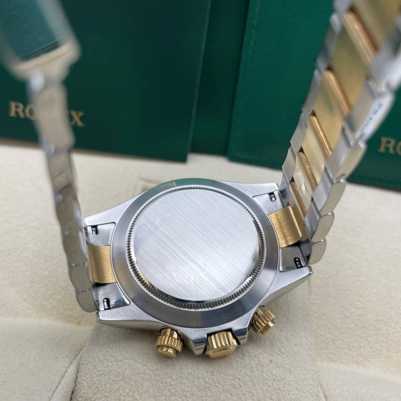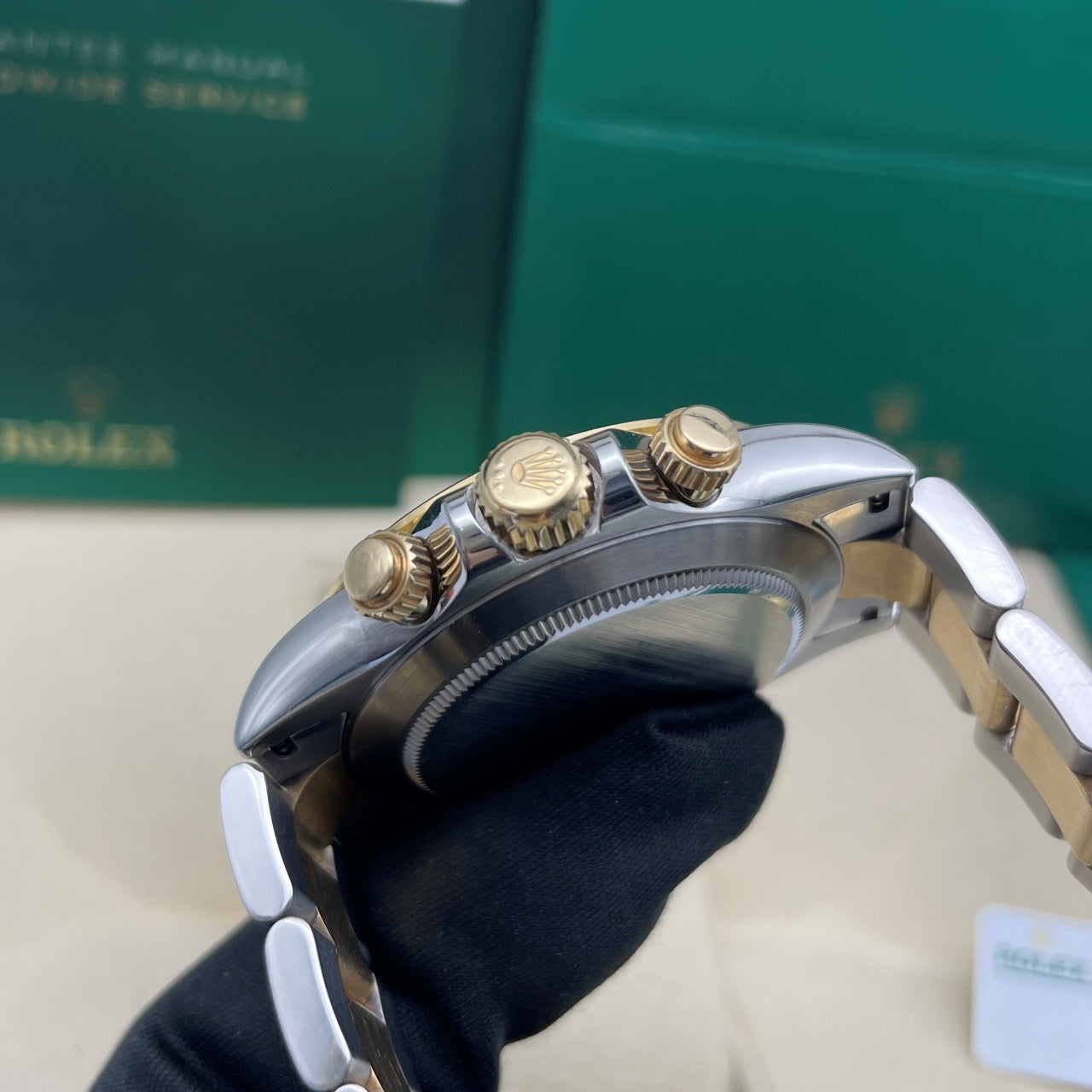 Elevate your wrist game with the Daytona 116503 — a bold expression of power and refinement. Crafted in two-tone Oystersteel and 18k yellow gold, the watch’s 40 mm case is framed by a gold tachymeter bezel that’s both functional and striking. The deep black dial offers a striking contrast, with diamond hour markers that add a flash of luxe to its sporty roots. Inside, Rolex’s legendary Calibre 4130 chronograph movement delivers 72 hours of precision, while the robust Oyster bracelet ensures comfort and durability. The Daytona 116503 isn’t just a timekeeper — it’s a high-octane symbol of achievement and timeless style.